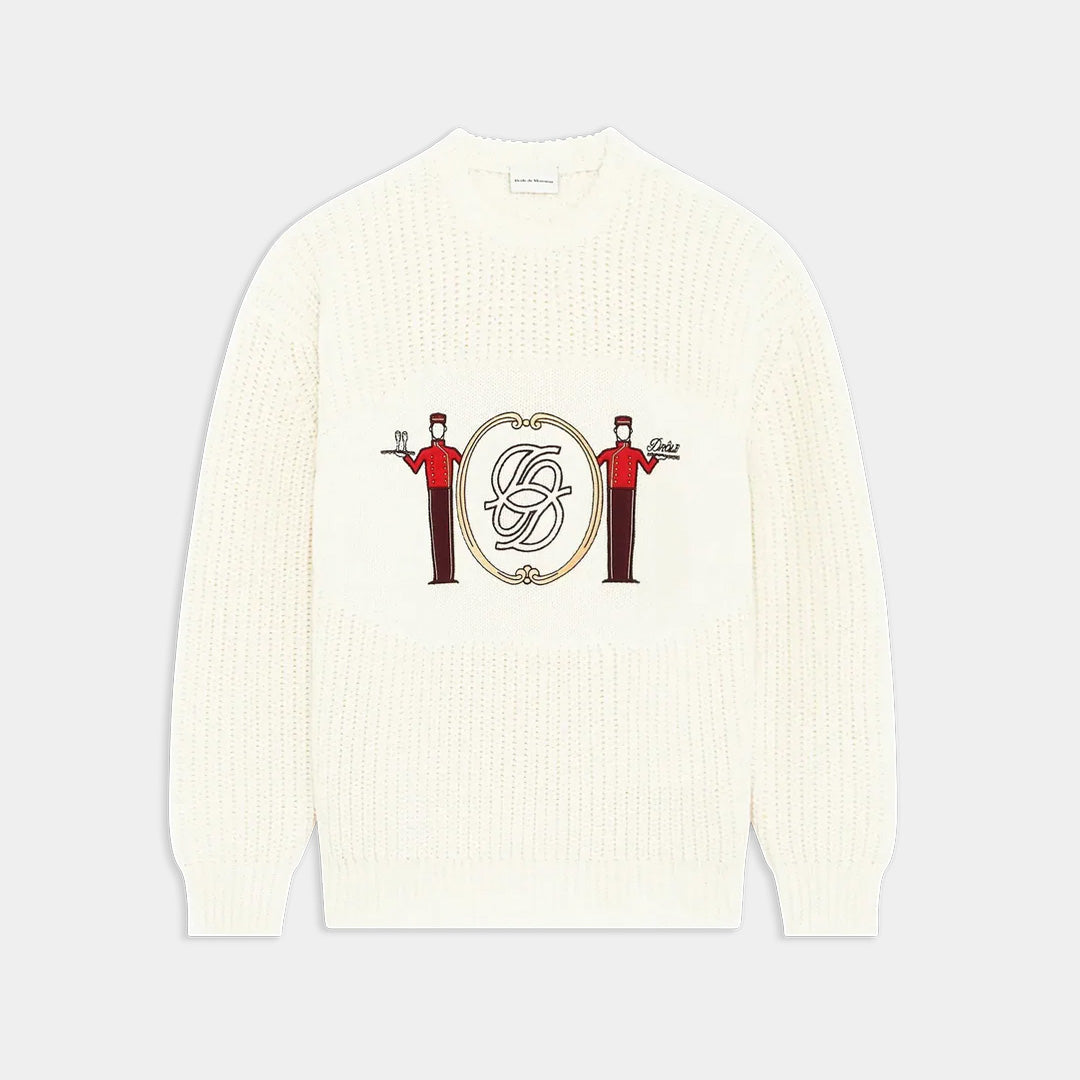 A refined knit with a relaxed silhouette. The La Maille Jacquard Groom sweater from Drôle de Monsieur is crafted from 100% merino wool with wide ribbing and raglan sleeves for comfort and movement. Its round neck and subtle “Groom” embroidery on the jersey yoke add quiet character to an otherwise timeless layer.