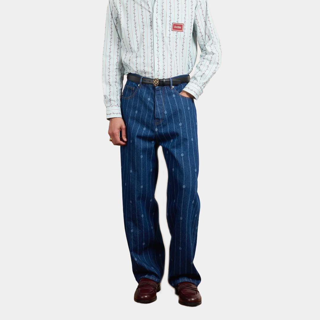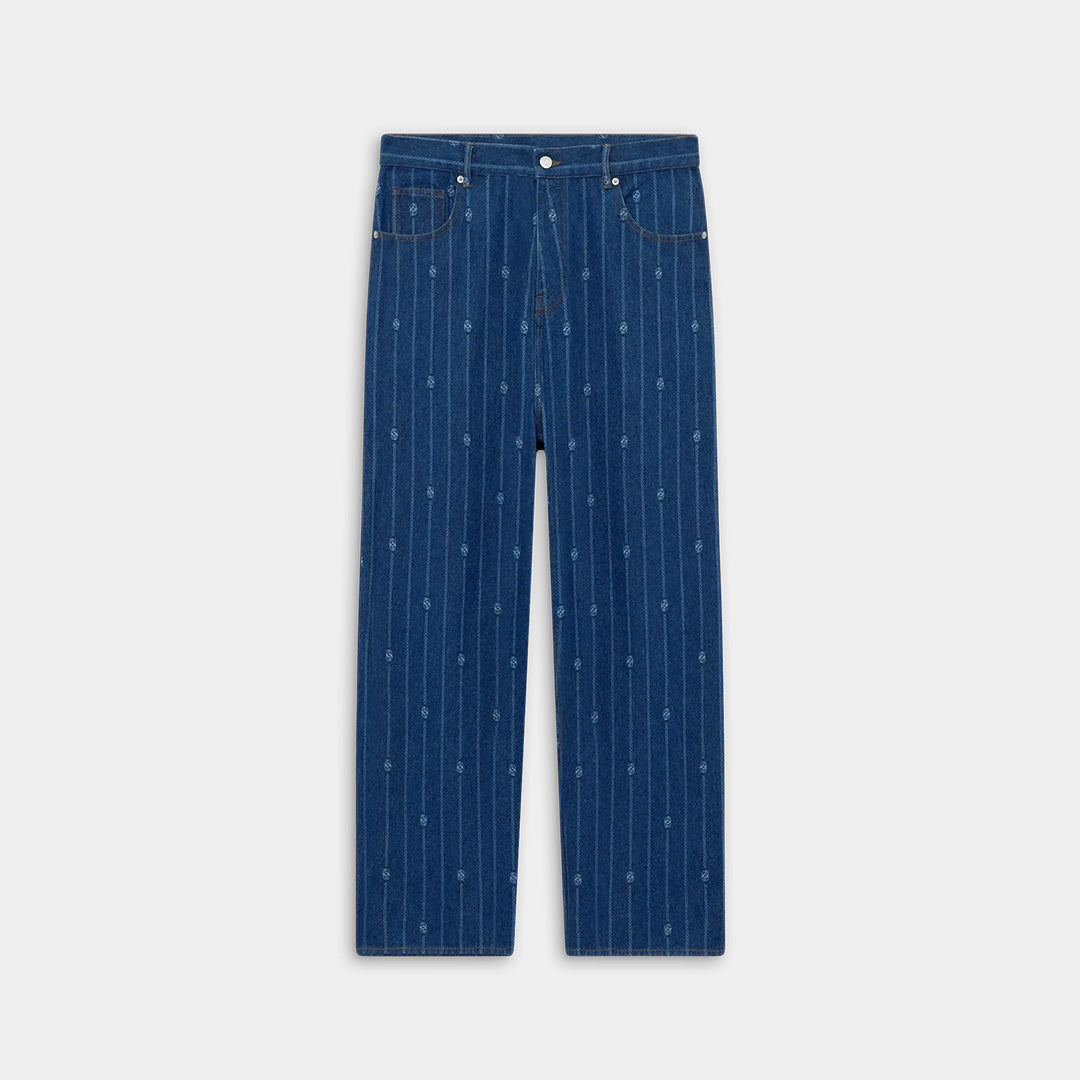 A signature take on relaxed denim. The Le Jean Baggy Monogramme from Drôle de Monsieur features a classic 5-pocket design in 100% cotton with bold Tresse Monogramme stripes for distinctive character. Cut in an oversized, low-waist silhouette, these jeans are finished with engraved rivets, a leather back patch and an engraved denim button for a refined touch.