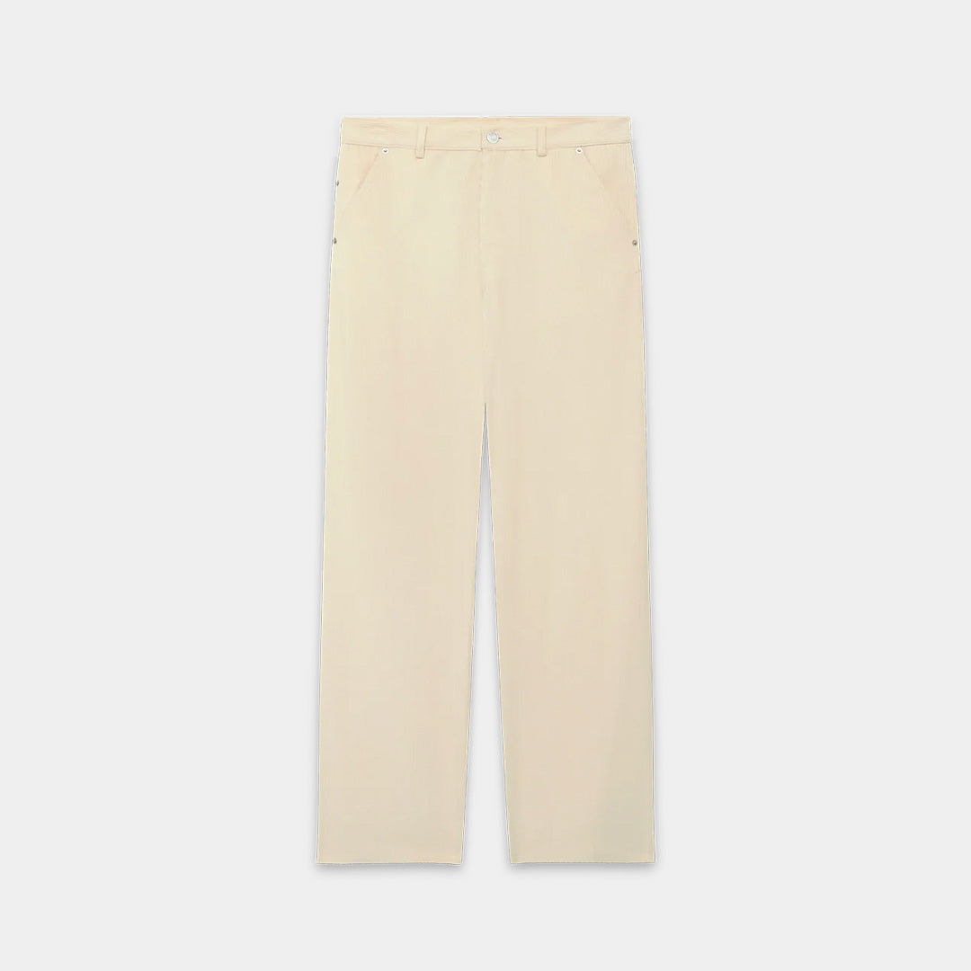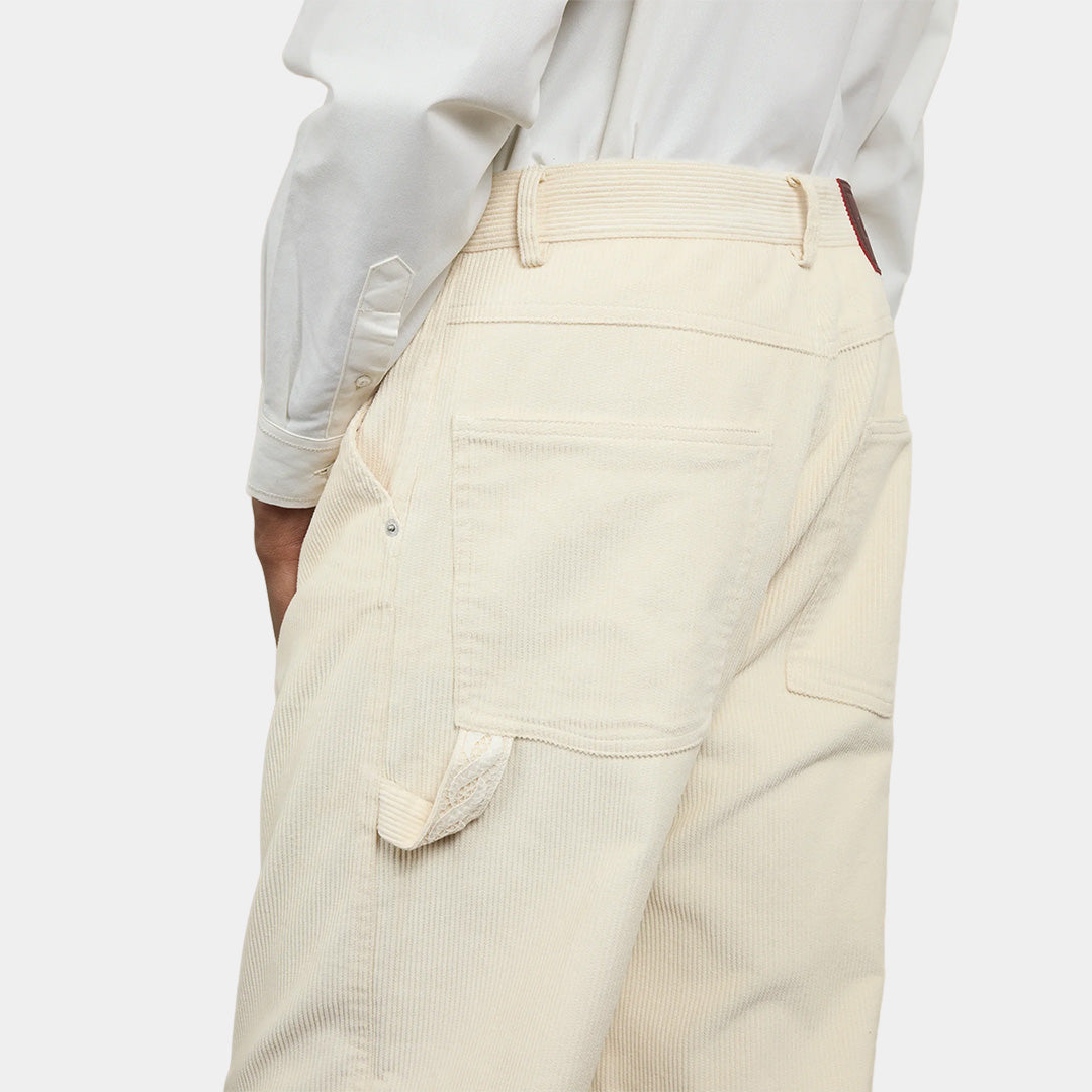 Effortlessly relaxed with a refined edge. The Le Pantalon Baggy Velours trousers from Drôle de Monsieur are cut from 100% cotton corduroy in a soft cream tone. Featuring a classic 5-pocket design, low waist and relaxed oversized fit, they’re elevated with carpenter details and a subtle lace Tresse insert. Finished with engraved rivets, a leather back patch and engraved button for a signature touch.